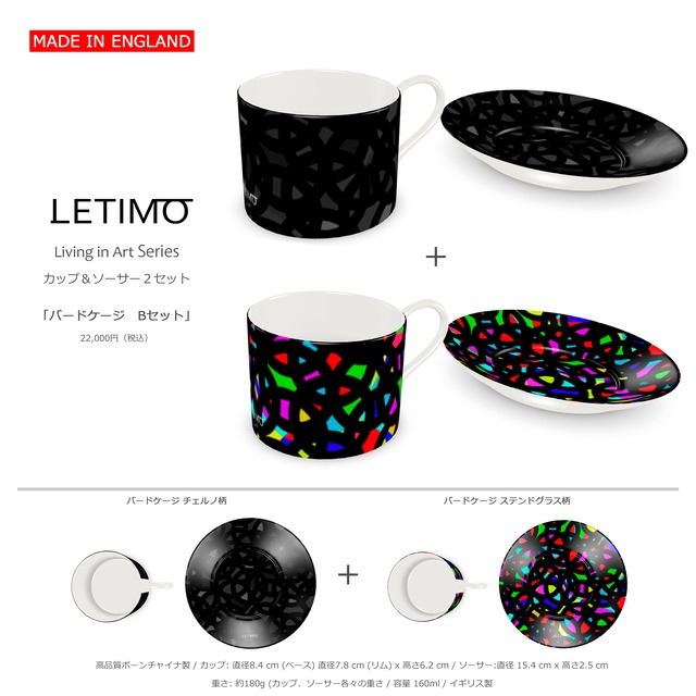 バッグや小物でのデザインで使用されているレティモのモダンなデザインを使用したテーブルウェア。(全16種類) 「バードケージBセット」 バードケージ チェルノ柄& バードケージ ステンドグラス柄 高品質ボーンチャイナ製 / カップ: 直径8.4 cm (ベース) 直径7.8 cm (リム) x 高さ6.2 cm / ソーサー:直径 15.4 cm x 高さ2.5 cm 重さ: 約180g (カップ、ソーサー各々の重さ / 容量 160ml / イギリス製